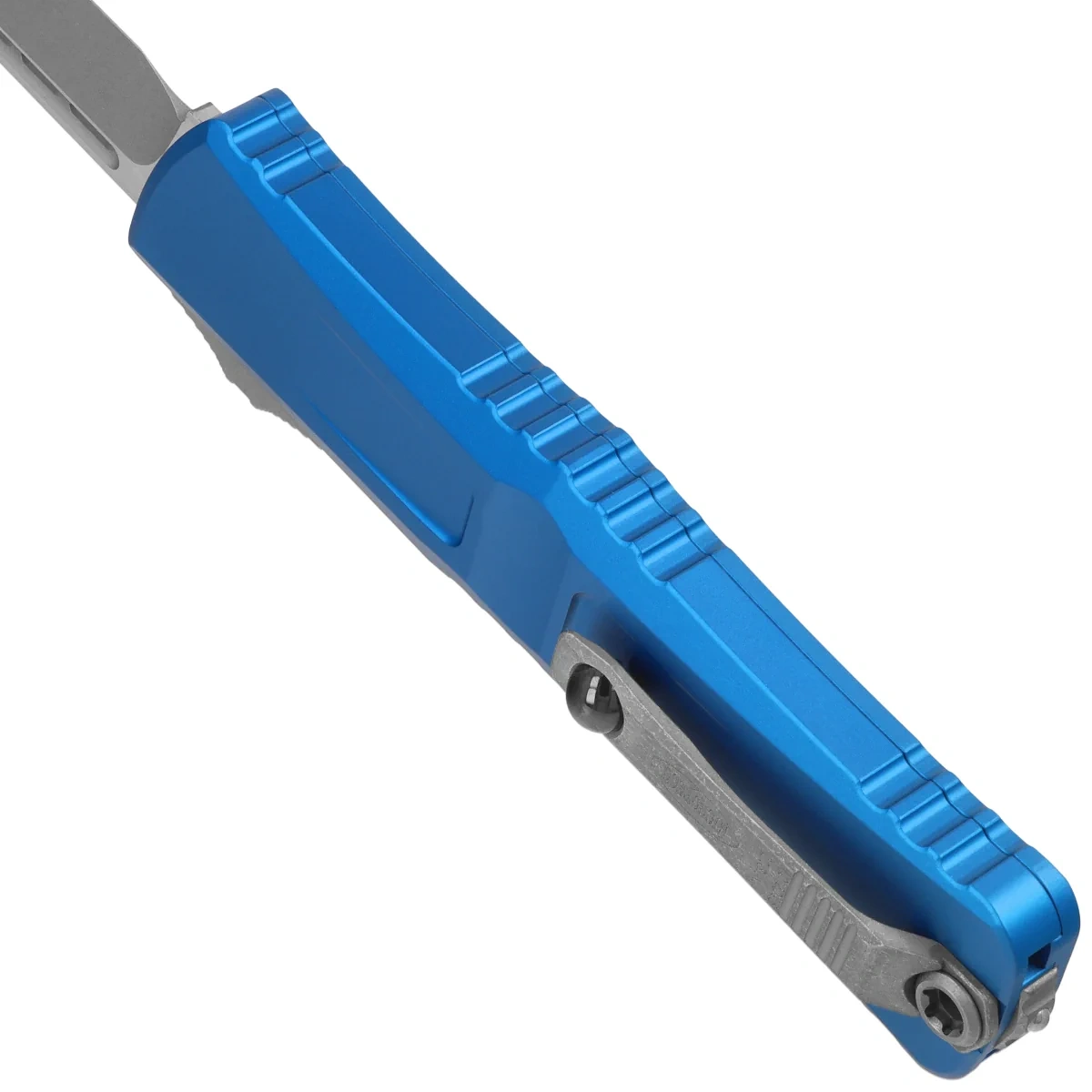 Rękojeść - wykonana z doskonałą precyzją w technologii 3D na frezarkach CNC, z pokrytego powłoką Mil-Spec aluminium 6061-T6. Faktura powierzchni rękojeści oraz głębokie nacięcia (jimping) na niej sprawiają, że nóż nie ślizga się w dłoni podczas używania. Smukły profil oraz frezowany dwupozycyjny (prawa/lewa) masywny klips typu deep carry, umożliwiają dyskretne przenoszenie noża w kieszeni, w pozycji tip-down (czubkiem ostrza do dołu). Wyposażony w gładką kulkę rollerball, dzięki której nóż z łatwością wsuwa się do kieszeni nie niszcząc brzegów kieszeni. Na klipsie znajduje się logo Microtech i data produkcji. Rękojeść zakończono zbijakiem do bicia szyb, stalowy trójkąt, w który wprasowano kulkę z węglika wolframu.