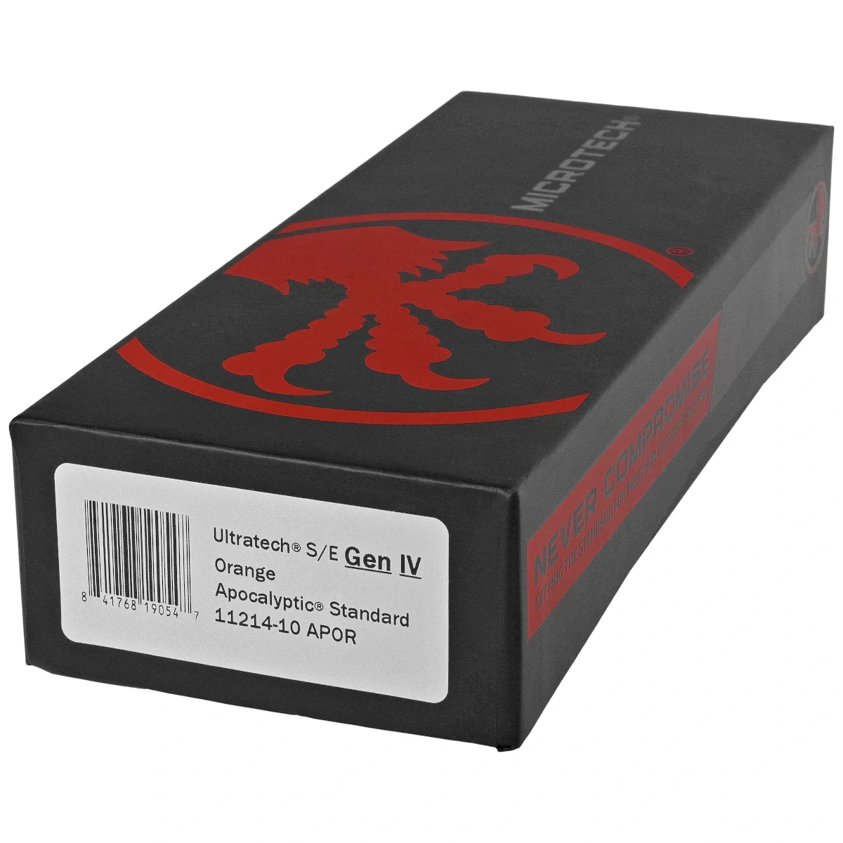 Ultratech Gen IV S/E Orange Aluminium, Apocalyptic to pełnowymiarowy nóż automatyczny OTF (Out The Front) z serii Ultratech. Czwarta generacja wyróżnia się szeregiem usprawnień, takich jak; Crud Kutter™, Dual-Fuel Drive Train™. Przeprojektowano również rękojeść, wyposażając ją w rozwiązania znane z innych modeli. Pracujący w trybie D/A (Double Action), umożliwia błyskawiczne wysunięcie i schowanie ostrza za pomocą jednego ruchu kciuka. Projekt autorstwa Tony’ego Marfione, właściciela Microtech Knives, łączy w sobie nowoczesny design z najwyższą jakością wykonania.