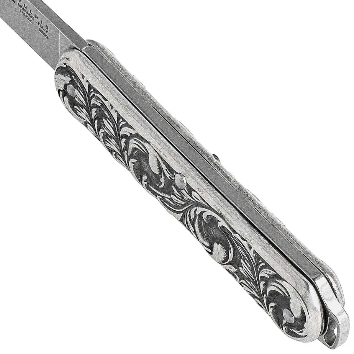 Rękojeść - okładziny Wykonane z misternie grawerowanego srebra próby 925. Prosty kształt świetnie dopasowuje się do każdej dłoni. W tylnej części kółko do przewleczenia linki asekuracyjnej lub ozdobnej.