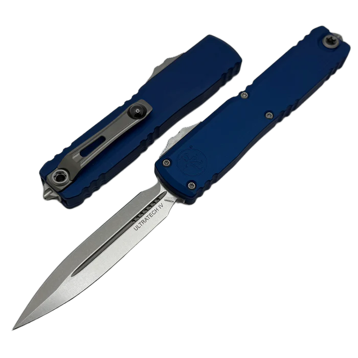 Ultratech Gen IV D/E Navy Blue Aluminium, Stonewashed to pełnowymiarowy nóż automatyczny OTF (Out The Front) z serii Ultratech. Czwarta generacja wyróżnia się szeregiem usprawnień, takich jak; Crud Kutter™, Dual-Fuel Drive Train™. Przeprojektowano również rękojeść, wyposażając ją w rozwiązania znane z innych modeli. Pracujący w trybie D/A (Double Action), umożliwia błyskawiczne wysunięcie i schowanie ostrza za pomocą jednego ruchu kciuka. Projekt autorstwa Tony’ego Marfione, właściciela Microtech Knives, łączy w sobie nowoczesny design z najwyższą jakością wykonania.