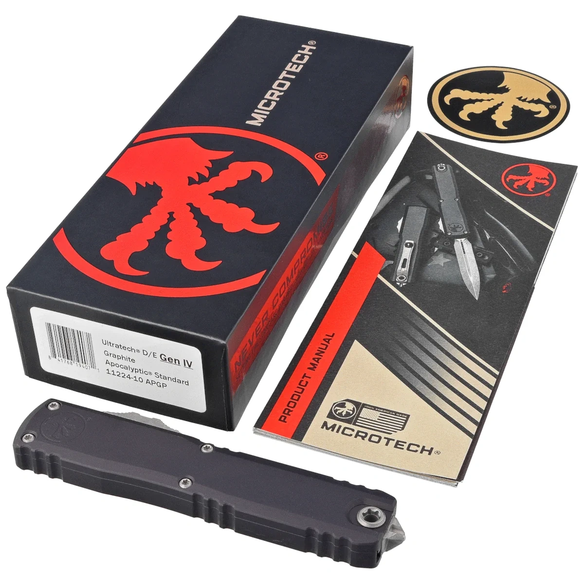 Ultratech Gen IV D/E Graphite Aluminium, Apocalyptic to pełnowymiarowy nóż automatyczny OTF (Out The Front) z serii Ultratech. Czwarta generacja wyróżnia się szeregiem usprawnień, takich jak; Crud Kutter™, Dual-Fuel Drive Train™. Przeprojektowano również rękojeść, wyposażając ją w rozwiązania znane z innych modeli. Pracujący w trybie D/A (Double Action), umożliwia błyskawiczne wysunięcie i schowanie ostrza za pomocą jednego ruchu kciuka. Projekt autorstwa Tony’ego Marfione, właściciela Microtech Knives, łączy w sobie nowoczesny design z najwyższą jakością wykonania.