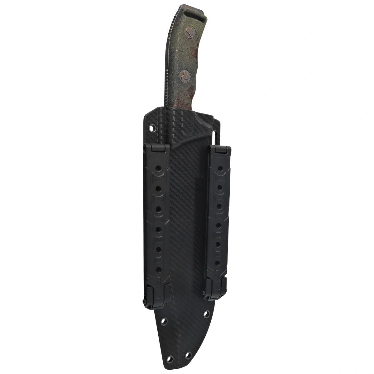 Pochwa - wykonana z kydexu laminowanego włóknem węglowym, zapewnia pewne trzymanie noża w dowolnej pozycji. Mocowanie typu M.O.L.L.E. na pas lub do oporządzenia umożliwia przenoszenie noża w pozycji pionowej lub poziomej.