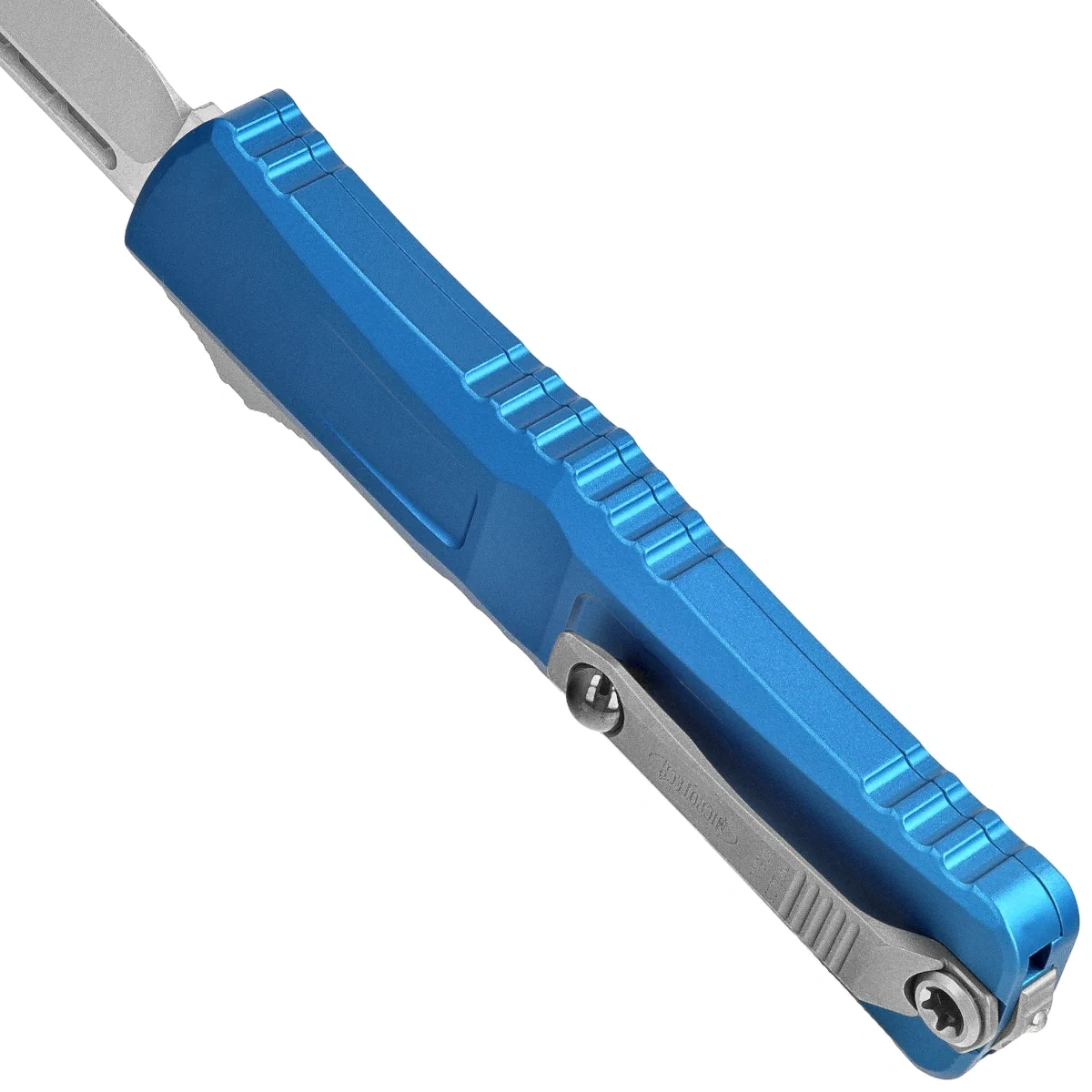 Rękojeść - wykonana z doskonałą precyzją w technologii 3D na frezarkach CNC, z pokrytego powłoką Mil-Spec aluminium 6061-T6Faktura powierzchni rękojeści oraz głębokie nacięcia (jimping) na niej sprawiają, że nóż nie ślizga się w dłoni podczas używania. Smukły profil oraz frezowany dwupozycyjny (prawa/lewa) masywny klips typu deep carry, umożliwiają dyskretne przenoszenie noża w kieszeni, w pozycji tip-down (czubkiem ostrza do dołu). Wyposażony w gładką kulkę rollerball, dzięki której nóż z łatwością wsuwa się do kieszeni nie niszcząc brzegów kieszeni. Na klipsie znajduje się logo Microtech i data produkcji. Rękojeść zakończono zbijakiem do bicia szyb, stalowy trójkąt, w który wprasowano kulkę z węglika wolframu.