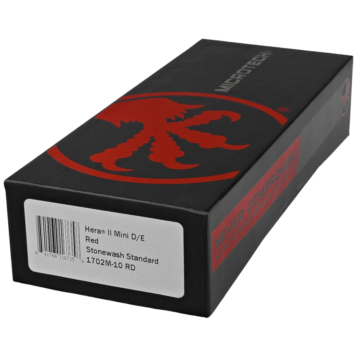 Hera II Mini D/E Red Aluminium, Stonewashed jeden z najbardziej wszechstronnych noży automatycznych OTF (Out The Front). Wzorowany na kultowym modelu Troodon, stanowi ogniwo pośrednie pomiędzy modelami EDC a konstrukcjami stricte taktycznymi. Automat o ponadprzeciętnej wytrzymałości z mechanizmem działającym w trybie D/A (Double Action) zapewniając szybkie, mocne i pewne wysuwanie oraz chowanie ostrza. Model wyróżnia się doskonałym spasowaniem elementów i najwyższą jakością wykończenia. Projekt autorstwa Anthony'ego Marfione, uznanego knifemakera i właściciela Microtech Knives.