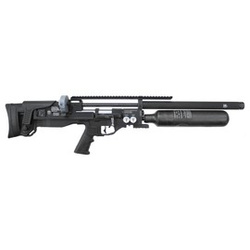 FACTOR BP PCP rifle in the bullpup version known for its offset chamber and magazine behind the trigger, carbon fiber cartridge, Side Lever reloading lever, firing power regulator, trigger mechanism adjustment knob, barrel with integrated suppressor