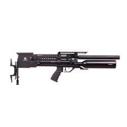 Reximex Meta Plus, nowoczesny bezkolbowy wielostrzałowy karabin PCP z powiększonym kartuszem, dźwignią przeładowania Side Lever, regulatorem, monopodem, stopką 3D oraz lufą ze zintegrowanym tłumikiem. Dostępny w kalibrach: 4.5 mm, 5.5 mm, 6.35 mm