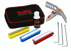 Smith's Standard Precision knife sharpening system offers an easy way to sharpen all types of knives. Kit includes coarse diamond stone, Arkansas fine natural stone, serrated edge sharpening rods, V-Lock vise.
