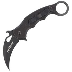 479 folder by Fox showcases how traditional Asian karambit knives have evolved. It features an Idroglider Black-coated Hawkbill blade made of Böhler N690Co steel, a Tip-Up clip and three quick-opening systems: Emerson hook, flipper, and an oval thumb hole