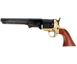 1851 REB Confederate, designed by Samuel Colt, a six-shot, percussion, black powder, 44 cal., Front-loaded revolver with a brass frame. Trigger cover (bow), handle fittings made of polished brass. 7.357 inch round barrel.