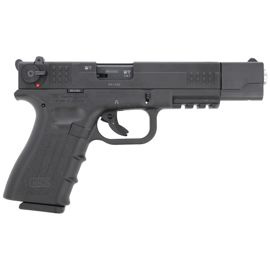 111002 pistolet bocznego zapłonu ISSC M22 TGT GEN 2 Black do treningu praktycznego lub sportowego z kompenstorem-obciążnikiem. Regulowane przyrządy celownicze, magazynek 10 naboi, mechanizm spustowy SA. Konstrukcja szkieletu zbliżona do pistoletu Glock...