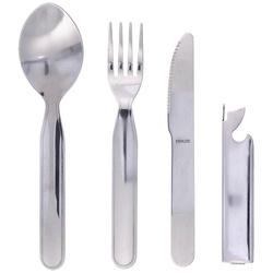 Camping 4 Set Stainless, Mirror – kompaktowy niezbędnik turystyczny od Martinez Albainox wykonany ze stali nierdzewnej 3Cr13MoV. Zawiera nóż, widelec, łyżkę i otwieracz w praktycznym nylonowym etui – idealny zestaw na biwak i podróż.